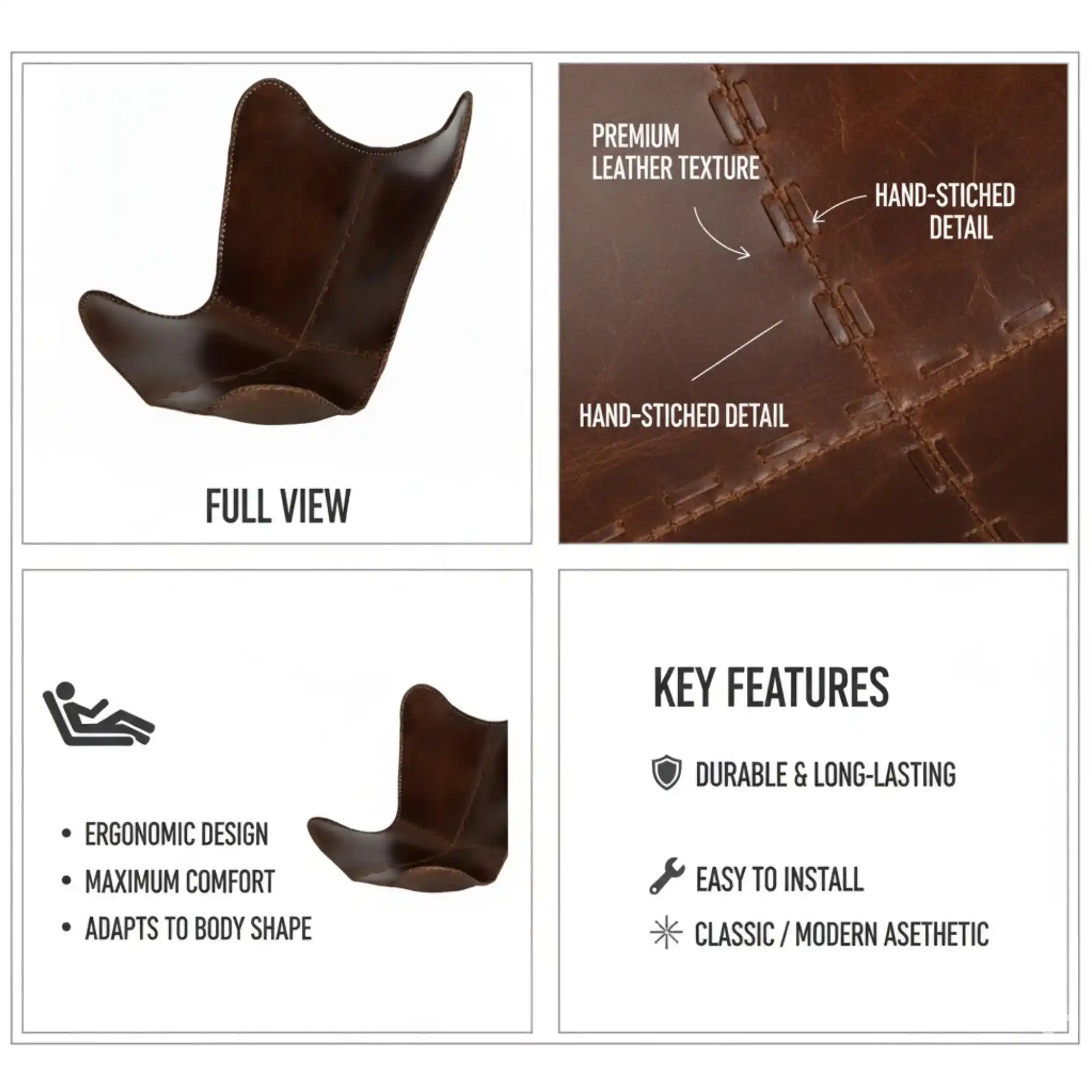 Elevate your living room luxury with the Saintstag Premium Classic Dark Brown Leather Butterfly Chair Cover, tailored specifically for BKF Leather Classic and Elegant chairs. Crafted from exquisite Classic Dark Brown leather, this cover exudes sophistication and elegance, enhancing the ambiance of any room. Immerse yourself in ultimate comfort while making a stylish statement with this accent chair cover. Ideal for Cyber Monday and Black Friday gifts, this cover is a perfect blend of style and relaxation.
