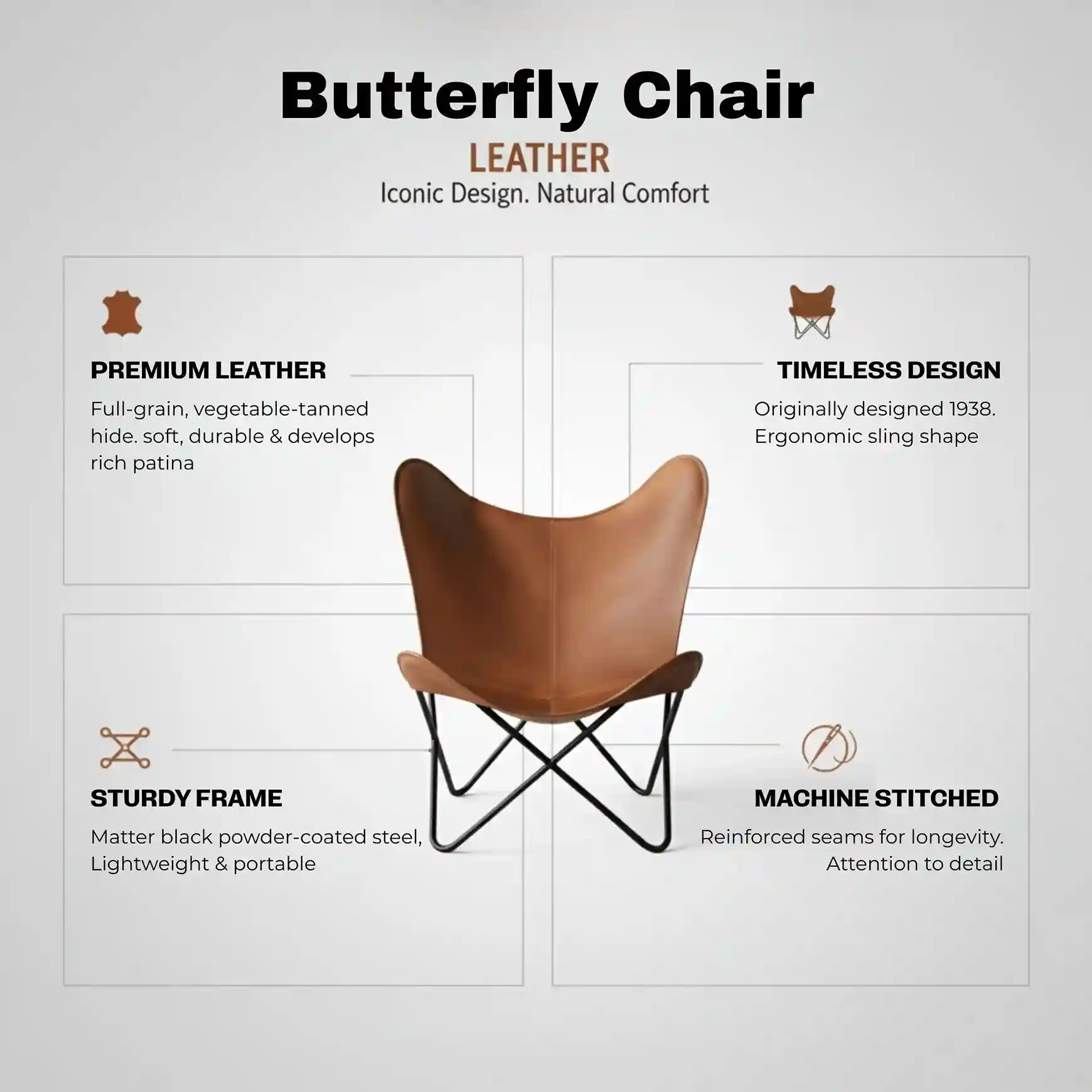This Exquisite Leather Butterfly Chair embodies timeless elegance and exceptional comfort. Featuring a sleek silhouette that complements any interior space, this iconic chair combines classic mid-century design with premium materials for a sophisticated addition to your home.
