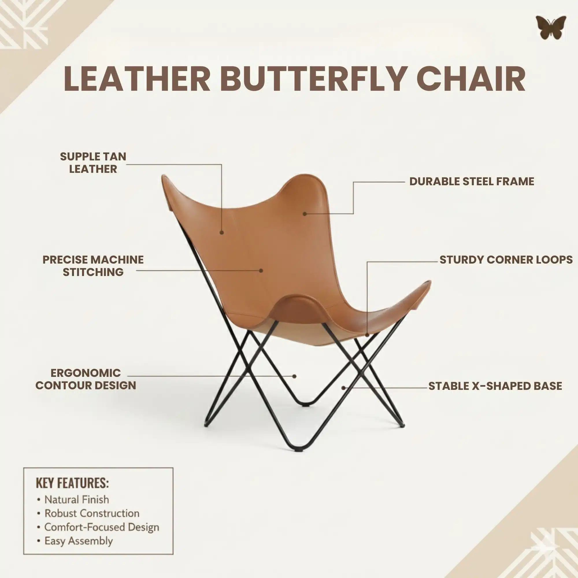 This Exquisite Leather Butterfly Chair embodies timeless elegance and exceptional comfort. Featuring a sleek silhouette that complements any interior space, this iconic chair combines classic mid-century design with premium materials for a sophisticated addition to your home.